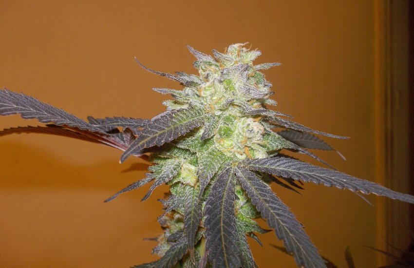 パープル・クッシュ。この美しい色合いの交配種は、幅広の小葉でクッシュの血統を受け継いでいることが分かります。