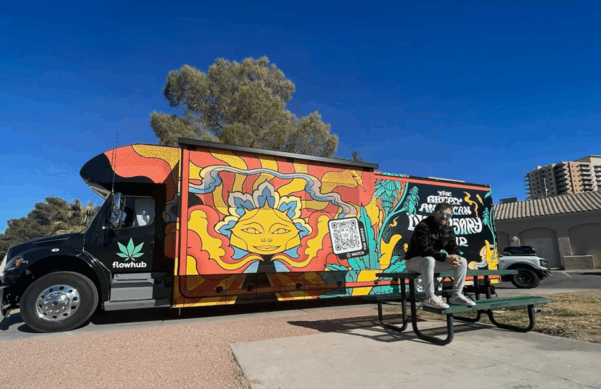 私側面に「The Great American Dispensary Tour」と大きく煙のような文字で書かれたバスを見逃すことはまずないでしょう。そのバスの縁には、グレイトフル・デッドのポスターにインスパイアされたような大麻の絵が描かれています。このバスの目的は、様々な州、生産者、そして消費者が合法大麻をどう形作っているかをリアルタイムで探る新しいドキュメンタリーシリーズを制作することなので、人目を引くことは問題ではありません。