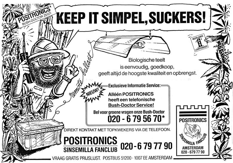 これは大麻の父の人生における共通のテーマです。何かが商業的になりすぎたり、仕事のように感じ始めたりした時、彼は新たな冒険に乗り出します。例えば1985年、ワーナードはアムステルダムにヨーロッパ初の栽培ショップ「ポジトロニクス」をオープンしました。彼の店では、アメリカとイギリスから輸入した栽培用ライトやその他の栽培機器を販売していました。ポジトロニクスは、オランダをはじめとする世界各地で急成長する大麻栽培市場において、重要な役割を担うようになりました。ワーナードは独自の栽培用ライトと植物栄養素の製造を開始しました。